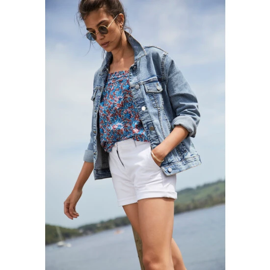 Camisole tops are a true summer essential because they’re easy to style and allow your shoulders to feel the sun too! Our new Abby cami has a floaty, a-line shape through the body and is adorned in a hand-drawn print bursting with beautiful blooms. It has a pleated band to the top with a pretty frilled edges and is finished with a Joules embroidered hare to the hem.