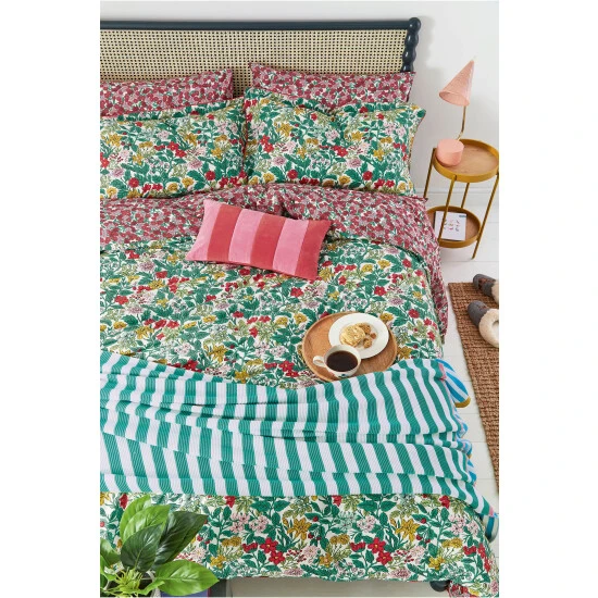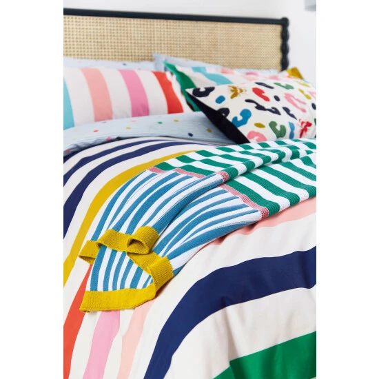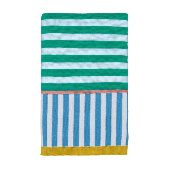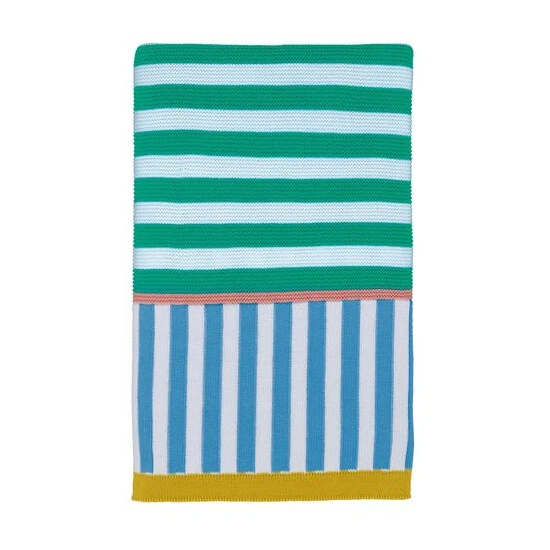 Fresh, bright and oh-so-colourful, this striped knitted throw is perfect for adding a touch of contemporary style to your bedroom, living room, or wherever you fancy! It features fresh green and crisp white horizontal stripes, contrasted with a vertical sky blue and white striped border to both ends. For even more pops of colour, pink and antique gold makes an appearance too. How and where will you style it?